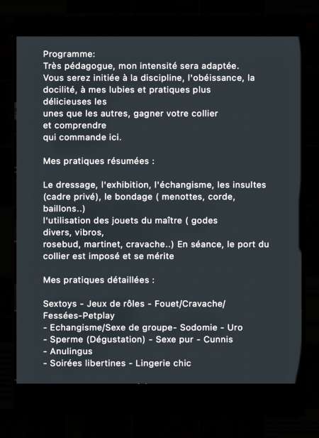 Bienvenue, Curieuses ou débutantes acceptées. Uniquement pour femmes (100 hetero) Je reçois. Pratiques et programme à lire sur les photos Pour les couples : éducation bdsm, rendez vous candau, trio, organisation de pluralité/gang bang.